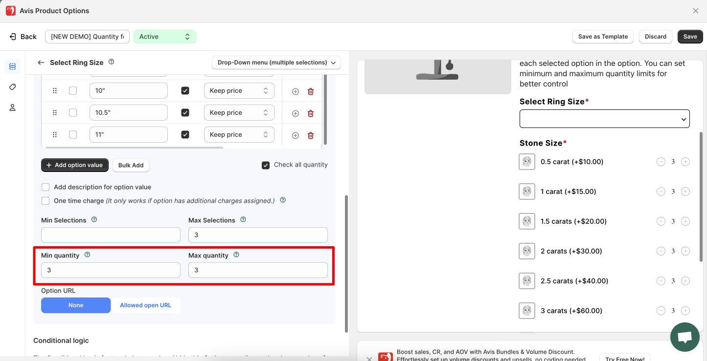 * **Min Quantity**: The **lowest number** of an option value that a customer can select.&#x20;