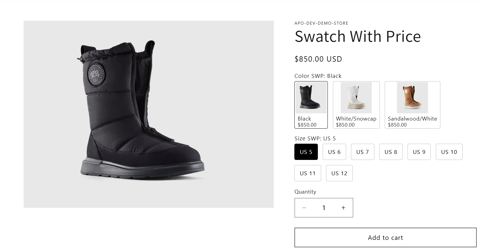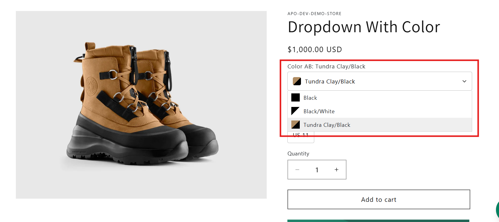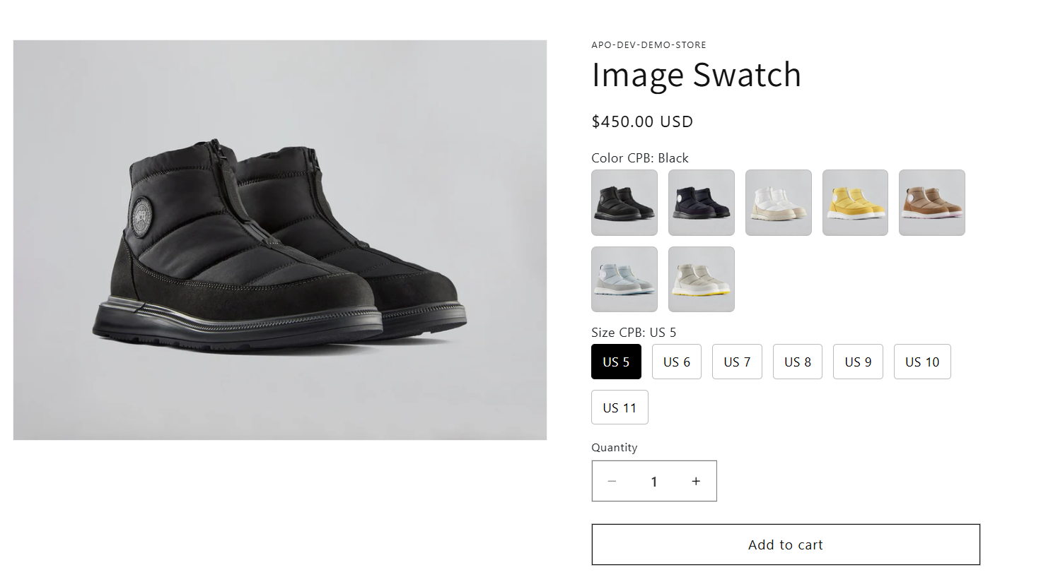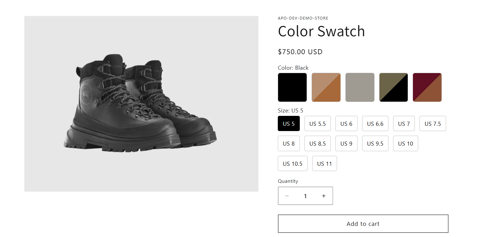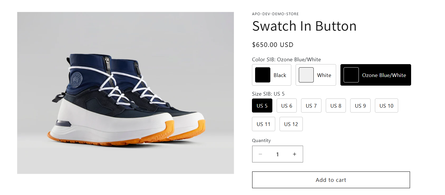 On the **product page**, options are displayed with enhanced visuals while still mapping to the variants you’ve already created in Shopify Admin.